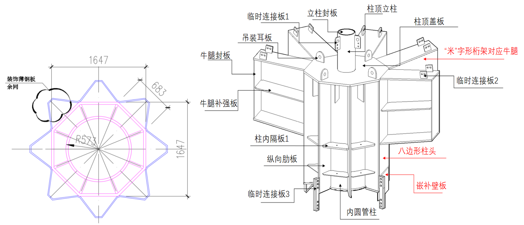 立异效果1:研制了一种内圆管外八边(下部四边)形异型截面钢柱以及该异型柱制造的K型+对接的组合接头,满意了规划对异型柱的结构要求,降低了异型钢柱的加工难度。