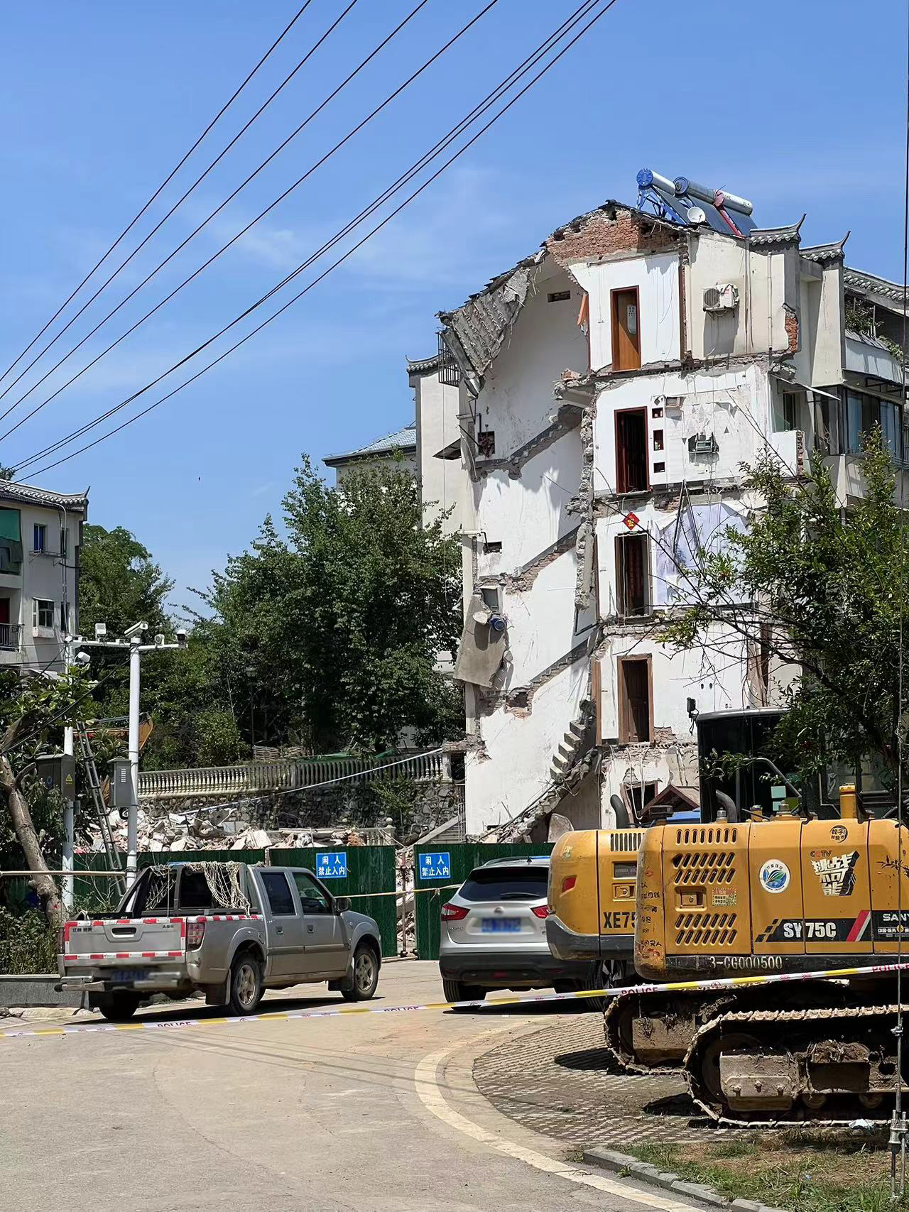 澎湃新闻走访现场发现,事发楼栋西侧单位整体坍塌,现场已被铁皮围挡包围,拉起了警戒线。